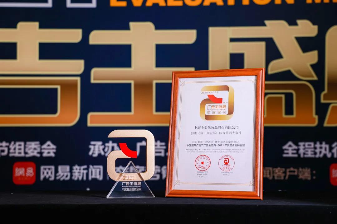 2021年12月12日,中國(guó)國(guó)際廣告節(jié)2021廣告主盛典在福建廈門(mén)舉行, 2021中國(guó)廣告主獎(jiǎng)隆重揭曉,上美集團(tuán)“韓束《每一刻冠軍》體育營(yíng)銷(xiāo)大事件”從一眾優(yōu)秀案例中脫穎而出,摘得 “2021年度整合營(yíng)銷(xiāo)金案”大獎(jiǎng)。