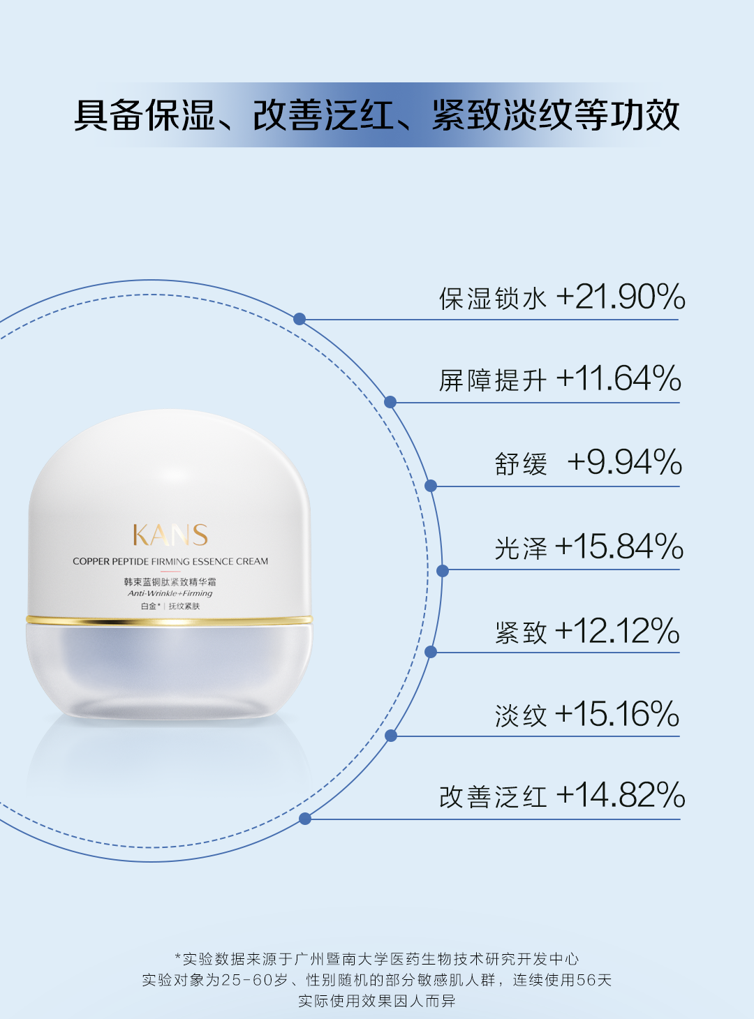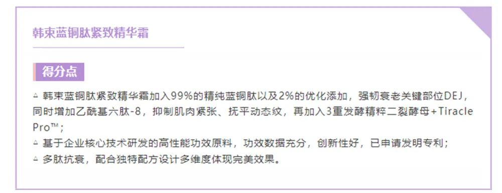 在配方運用中,韓束科研團隊將TIRACLE PRO復配純度高達99%的藍銅肽,與藍銅肽實現(xiàn)協(xié)同增效。從而更好發(fā)揮藍銅肽五大天然優(yōu)勢:減少炎性反應及自由基損傷、抗衰緊致、保護和修護屏障、舒緩褪紅、安全低刺激。經(jīng)過多輪配方打磨,韓束藍銅肽白金緊致系列產(chǎn)品誕生。