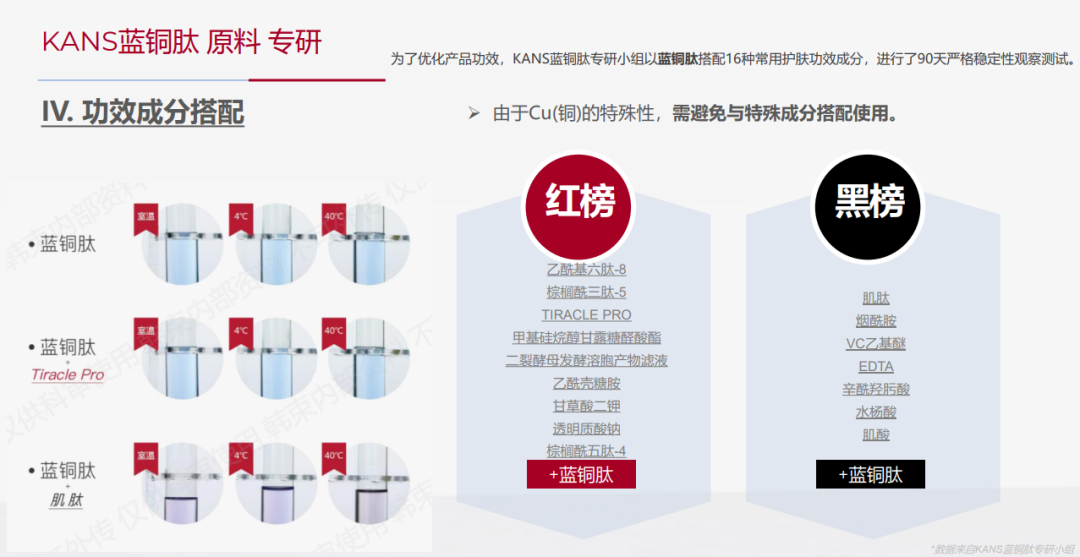 我們團(tuán)隊(duì)還做了一件有意義的事,我們篩選了16種功效成分,進(jìn)行了為期90天穩(wěn)定性觀察及銅肽含量檢測(cè),找到了那些讓銅肽失活的功效成分,做出了這一張藍(lán)銅肽復(fù)配紅黑榜,也希望能為行業(yè)正確使用藍(lán)銅肽,提供一份參考和借鑒。