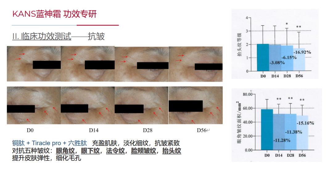 在淡紋方面,所有受試者眼角紋和抬頭紋56天平均下降15%~17%,顯著對(duì)抗眼角紋、眼下紋、法令紋、臉頰皺紋、抬頭紋五種皺紋。