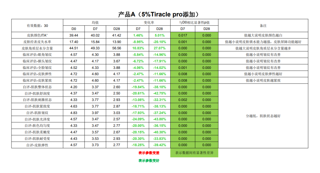 在SGS人體功效測(cè)試中,含5% Tiracle pro爽膚水,在受試者使用7天,28天后,評(píng)估抗皺修護(hù)舒緩保濕等功效,都取得了顯著的優(yōu)異結(jié)果。