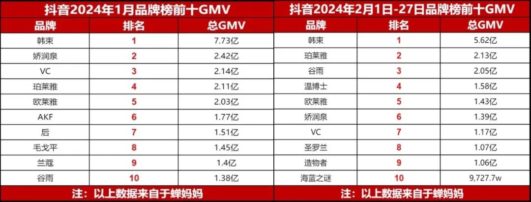 2024年1月,韓束以7.73億元GMV、同比增長(zhǎng)756%的優(yōu)異表現(xiàn),再度登頂抖音。截至2024年2月27日,韓束仍以5.62億元GMV穩(wěn)坐2月榜單第一。