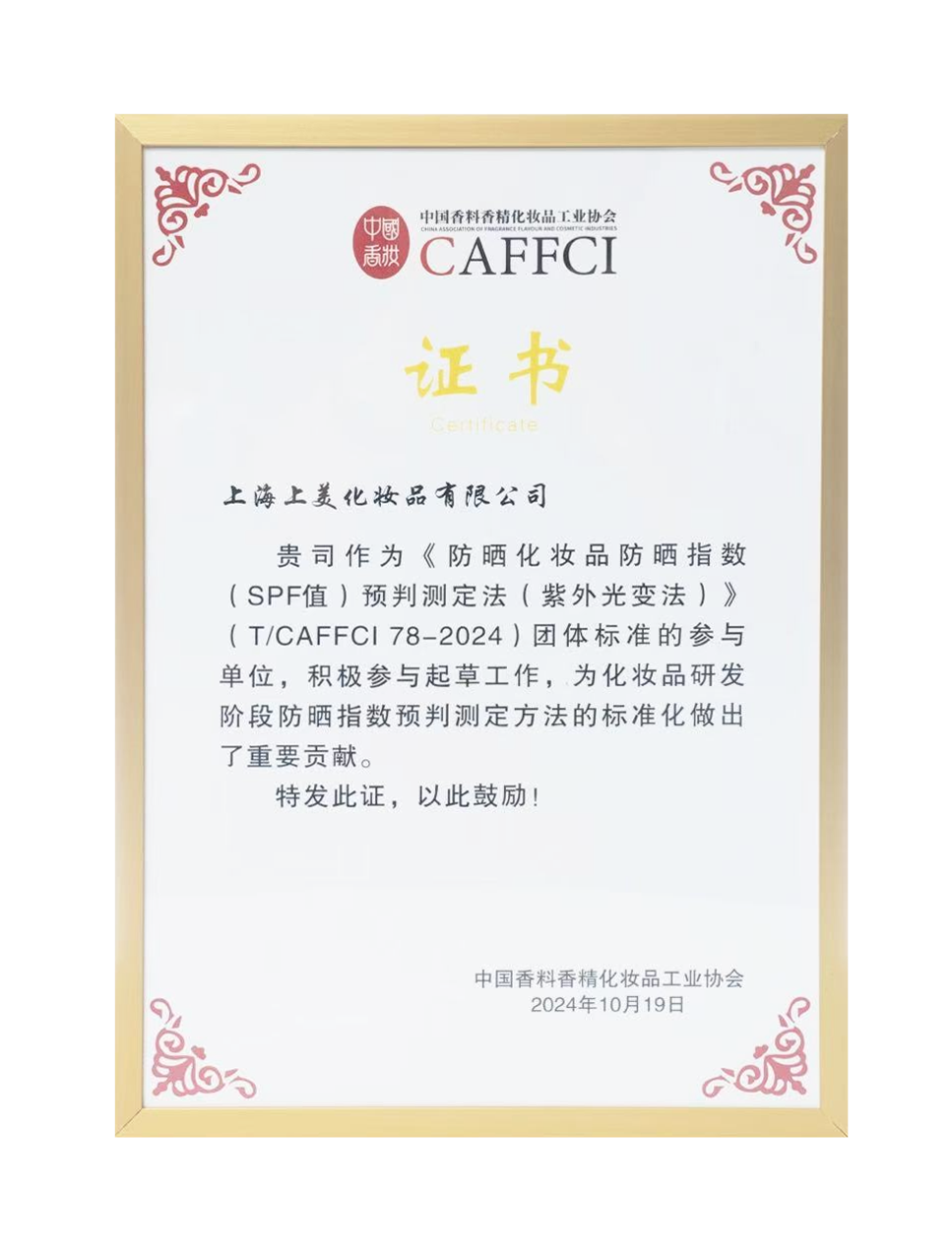 作為領(lǐng)軍企業(yè),上美股份也不斷推動(dòng)中國(guó)化妝品行業(yè)的進(jìn)步,參與多項(xiàng)行業(yè)規(guī)范和標(biāo)準(zhǔn)的制定。例如,今年,上美作為《防曬化妝品防曬指數(shù)(SPF值)預(yù)判測(cè)定法(紫外光變法)》(T/CAFFCI78-2024)團(tuán)體標(biāo)準(zhǔn)的參與單位,積極參與起草工作,因此也在本次大會(huì)上受到了香化協(xié)會(huì)表彰,感謝上美為化妝品研發(fā)發(fā)展做出的重要貢獻(xiàn)。