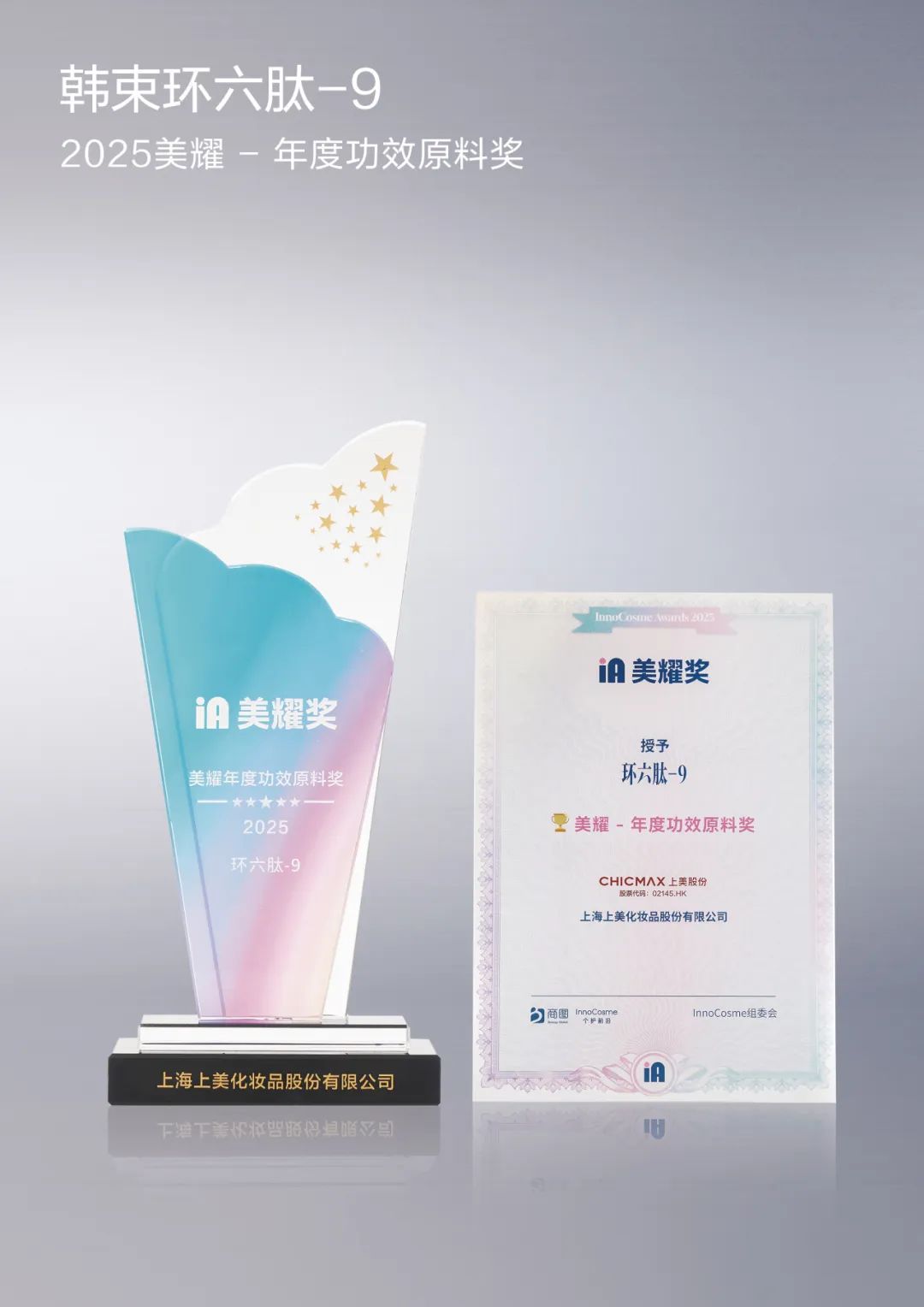 近日,2025 InnoCosme Awards 美耀獎正式揭曉,上美股份自研王牌成分「環(huán)六肽-9」榮獲InnoCosme Awards 2025 美耀年度功效原料獎。