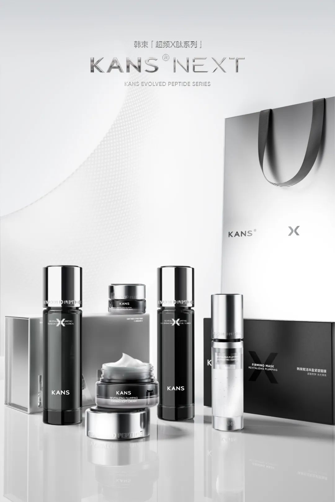此外在環(huán)六肽-9的技術加持下,韓束創(chuàng)新性地將環(huán)六肽-9與神經肽及小分子膠原肽復合,形成顛覆性抗衰組合「X肽」,深入肌膚,促生六大膠原,模擬信號傳遞,實現(xiàn)分層抗衰效果,全面改善松垮紋。目前,該成分也已應用于韓束X肽系列中。